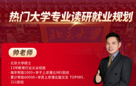 热门大学专业读研就业规划帅老师北京大学硕士13年教育行业从业经验每年帮助1000+学子上岸清北985院校累计帮...